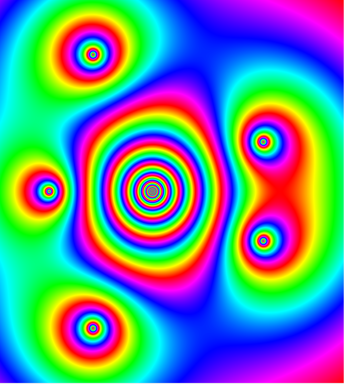 Die Auswirkung des Potenzierens mit – i – auf komplexe Funktionen sei am Beispiel der folgenden analytischen Funktion demonstriert. f = z^-3 – z ^2 – z ^-1 rechts nach Potenzierung mit i . Aus dem Zusammenlaufen der Farben, die eine Nullstelle anzeigt, wird ein Punkt bzw. Kreis bei mehrfacher Wiederholungs-schleife, hier k=0 bis 3 .