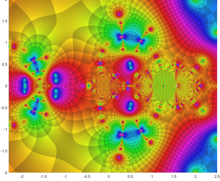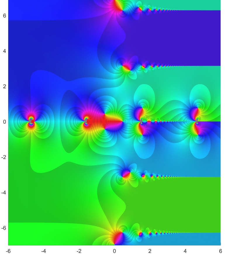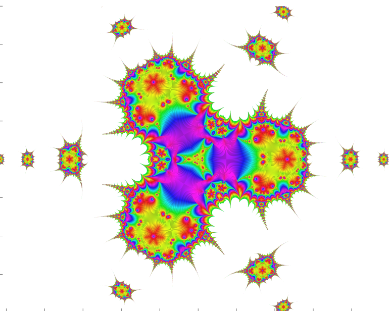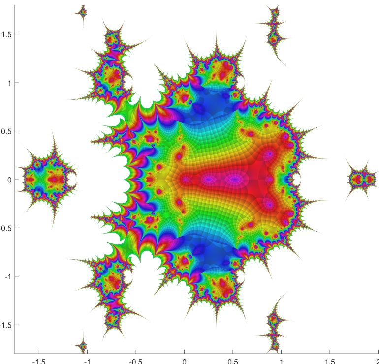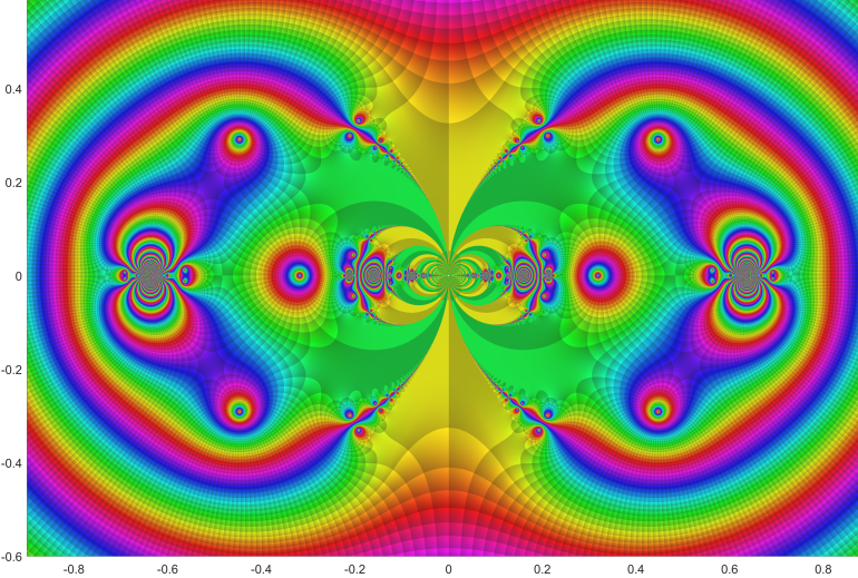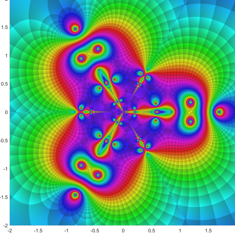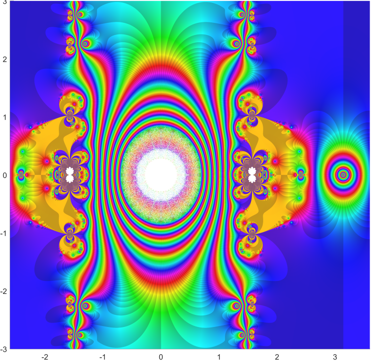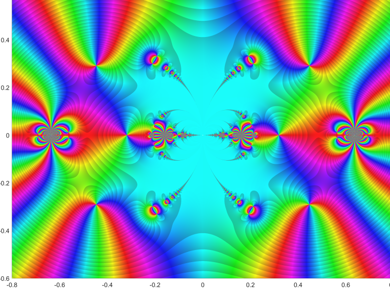 Starting point was the function f(z) = tan(sin(z)) – sin(tan(z)) . It was used by Cleve Moler to create an extremely attractive complex fractale.